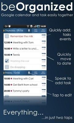 beOrganized - приложение исполняет функции календаря и менеджера задач, в приложении все синхронизируется с сервисами Google.
