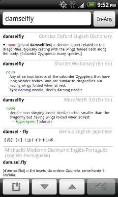 GoldenDict - это приложение оболочка для словарей. Работает с файлами: LSD, .DSL, .LSA, .DAT, .LD2, .BGL, StarDict, Dictd. Нужно только скопировать файлы в папку программы на карте памяти. Может переводить информацию из буфера обмена, для этого надо удерживайте кнопку (Поиск) на телефоне.
