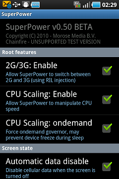 SuperPower 0.8.0 beta - приложение для автоматического управления Data, Wi-Fi, 2G/3G, CPU. Приложение может отключать GPRS/3G , Wi-Fi, переключать 2G/3G, уменьшать максимальную скорость CPU. Для работы программы необходимы права root пользователя.