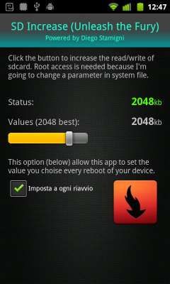 SD Speed Increase - Приложения для изменения параметра файловой системы, что управляет размером кэша на SD карте. Если увеличить значение 128кб которое по умолчанию до 2мб это повысит скорость чтения и записи. После перезагрузки устройства настройки сбрасываются но вы можете поставить приложение в автозагруку и тогда будут постоянно такие настройки.