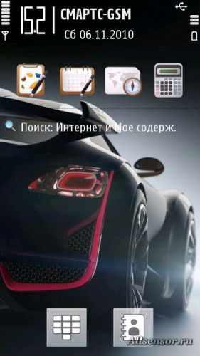 Тема Nokia с крутым спорткаром . Стандартный пак иконок заменен весь, частично сторонние приложения. С читаемостью наблюдаются некоторые сложности..